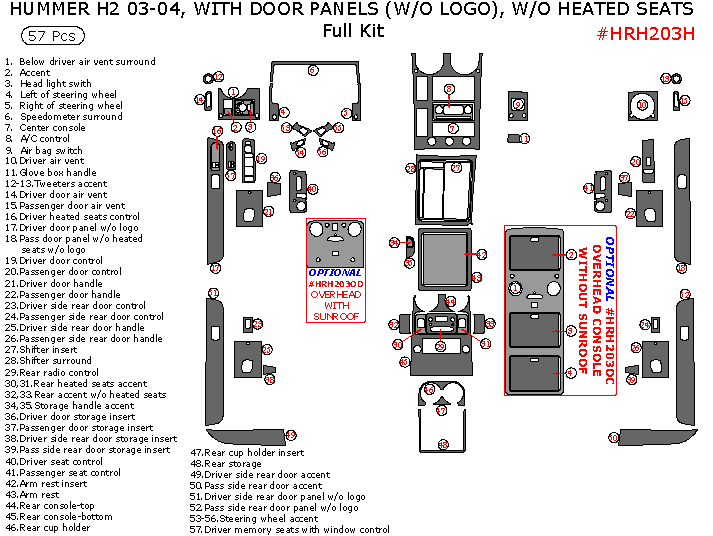 We offer a wide variety of colors and materials of Hummer H2 2003-2004, Full Interior Kit, With Door Panels (W/o Logo), W/o Heated Seats, 57 Pcs. Choose your favourite option and place an order.