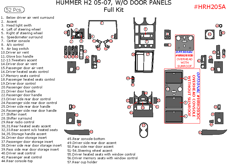Hummer H2 2005, 2006, 2007, Full Interior Kit, W/o Door Panels, 52 Pcs.