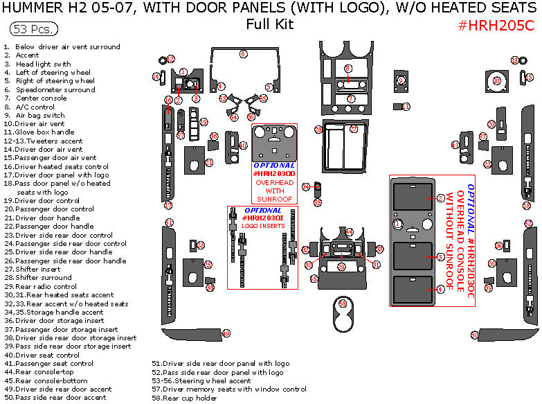Hummer H2 2005, 2006, 2007, Full Interior Kit, With Door Panels (With Logo), W/o Heated Seats, 53 Pcs.