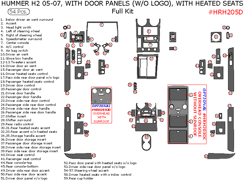 Hummer H2 2005, 2006, 2007, Full Interior Kit, With Door Panels (W/o Logo), With Heated Seats, 54 Pcs.