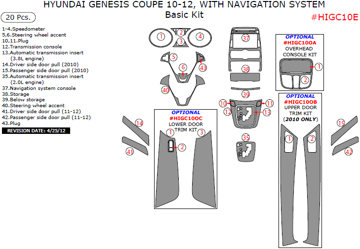 Hyundai Genesis 2010, 2011, 2012, Coupe, With Navigation System, Basic Interior Kit, 20 Pcs.