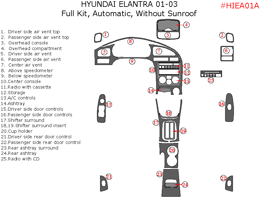 Hyundai Elantra 2001, 2002, 2003, Sedan, Full Interior Kit, Automatic, Without sunroof, 25 Pcs