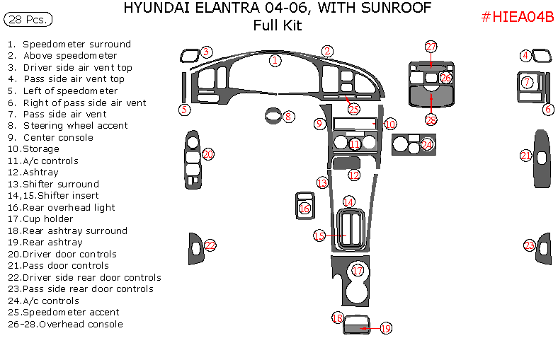 Hyundai Elantra 2004, 2005, 2006, Sedan, Full Interior Kit, With Sunroof, 28 Pcs.
