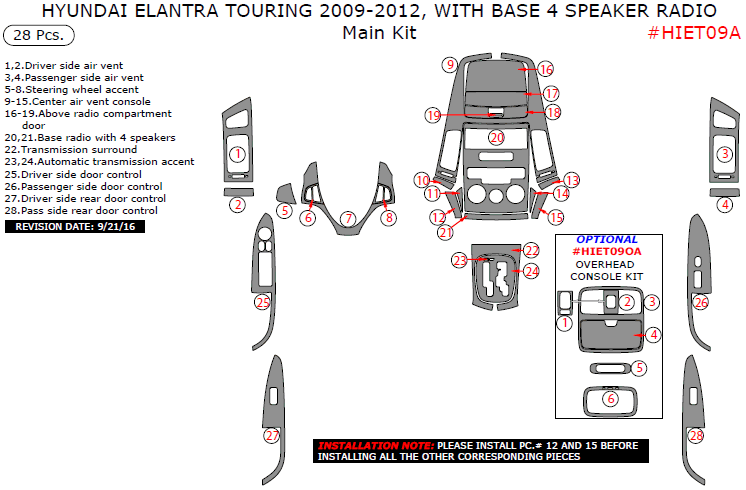 Hyundai Elantra Touring 2009, 2010, 2011, 2012, With Base 4 Speaker Radio, Main Interior Kit, 28 Pcs.