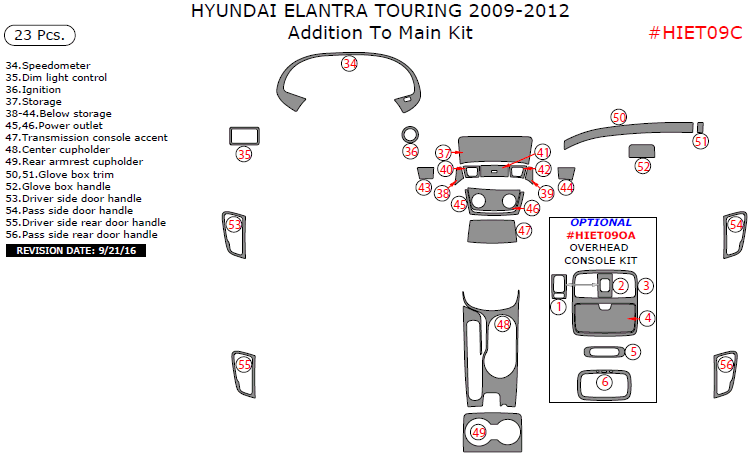 Hyundai Elantra Touring 2009, 2010, 2011, 2012, Addition To Main Interior Kit, 23 Pcs.