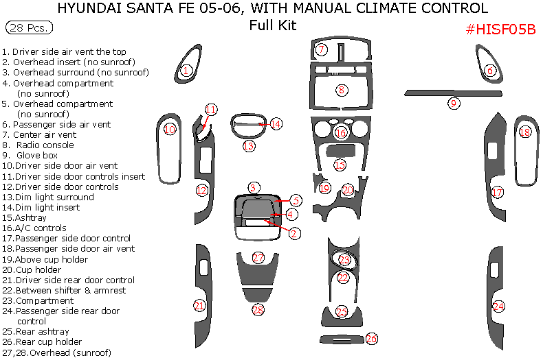 Hyundai Santa Fe 2005-2006, Full Interior Kit, With Manual Climate Control, 28 Pcs.