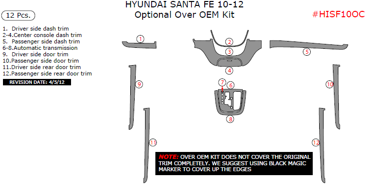 Hyundai Santa Fe 2010, 2011, 2012, Optional Over OEM Interior Kit, 12 Pcs.
