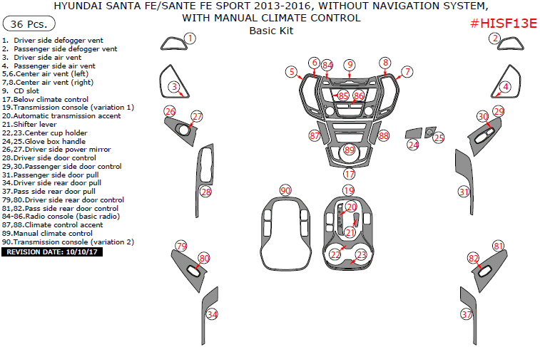 Hyundai Santa Fe/Santa Fe Sport 2013, 2014, 2015, 2016, Without Navigation System, With Manual Climate Control, Basic Interior Kit, 36 Pcs.