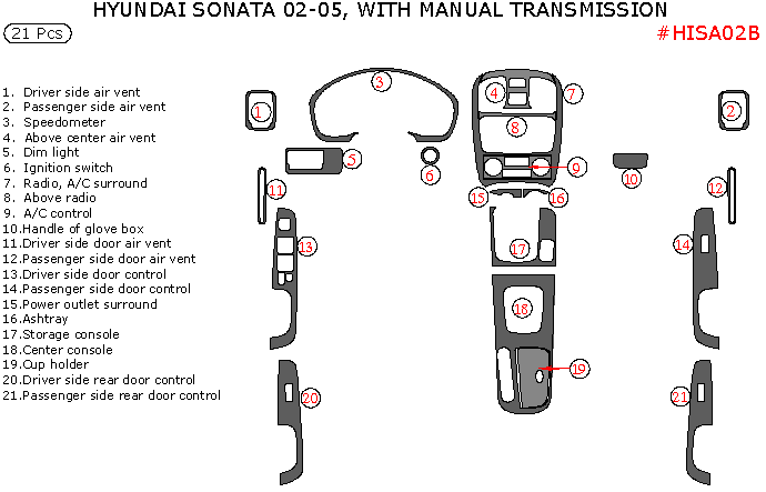 We offer a wide variety of colors and materials of Hyundai Sonata 2002, 2003, 2004, 2005, Interior Dash Kit, Manual, 21 Pcs. Choose your favourite option and place an order.