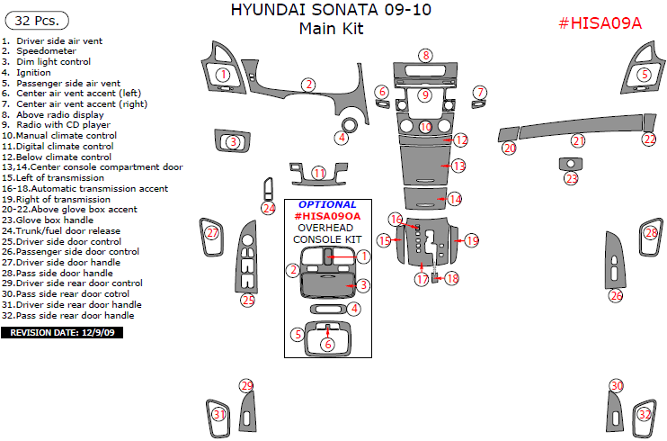 Hyundai Sonata 2009-2010, Main Interior Kit, 32 Pcs.