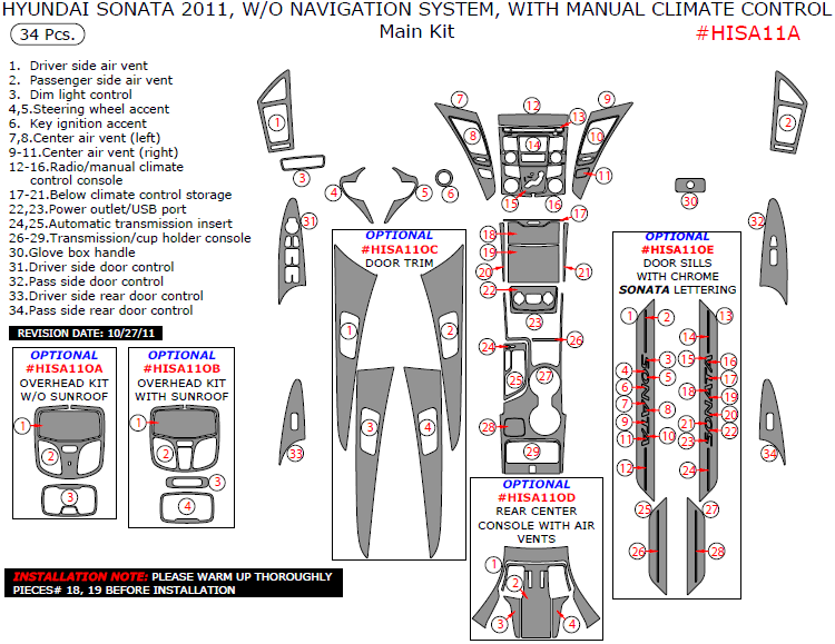 Hyundai Sonata 2011, W/o Navigation System, With Manual Climate Control, Main Interior Kit, 34 Pcs.