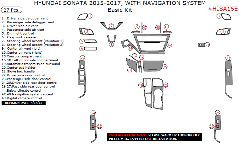 Hyundai Sonata 2015, 2016, 2017, With Navigation System, Basic Interior Kit, 27 Pcs.