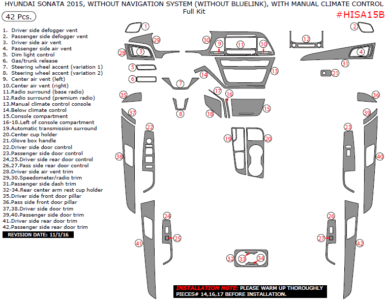 Hyundai Sonata 2015, Without Navigation System (Without Bluelink), With Manual Climate Control, Full Interior Kit, 42 Pcs.