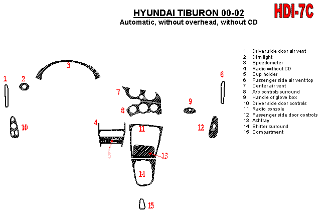 Hyundai Tiburon 2000, 2001, 2002, Interior Dash Kit, Automatic, Without CD, 15 Pcs