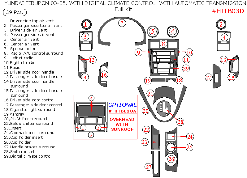 Hyundai Tiburon 2003, 2004, 2005, With Digital Climate Control, With Automatic Transmission, Full Interior Kit, 29 Pcs.