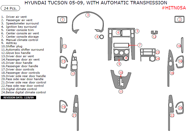 Interior Dash Kit of 24 pieces for Hyundai Tucson 2005, 2006, 2007, 2008, 2009, With automatic transmission, is available in a variety of colors and materials (carbon fiber, wood, etc.). Place your order on high-quality stainless dash trim kit after selecting your desired choice of this 2005-2009 Hyundai Tucson interior accessory.