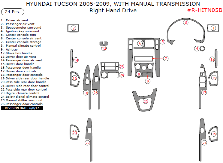 We offer a wide variety of colors and materials of Hyundai Tucson 2005, 2006, 2007, 2008, 2009, Interior Dash Kit, Right Hand Drive, With Manual Transmission, 24 Pcs. Choose your favourite option and place an order.