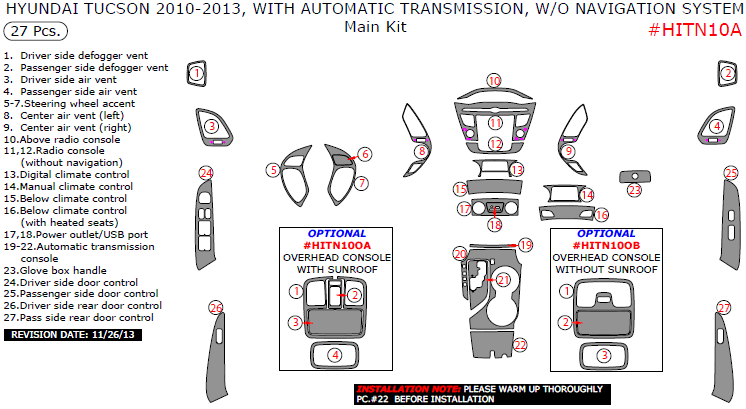 Hyundai Tucson 2010, 2011, 2012, 2013, With Automatic Transmission, Without Navigation System, Main Interior Kit, 27 Pcs.