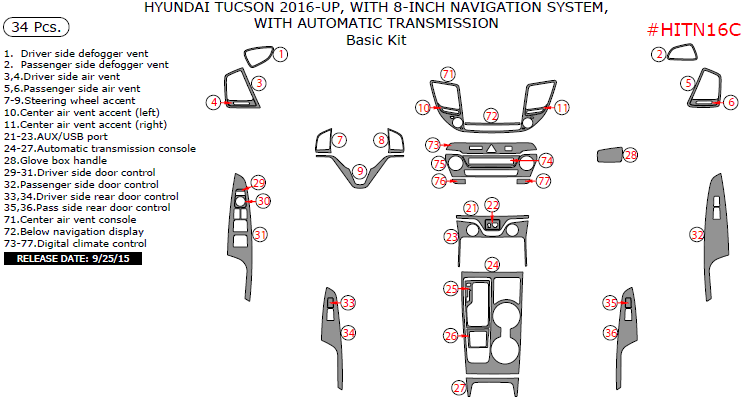 Hyundai Tucson 2016, 2017, With 8-Inch Navigation System, With Automatic Transmission, Basic Interior Kit, 34 Pcs.