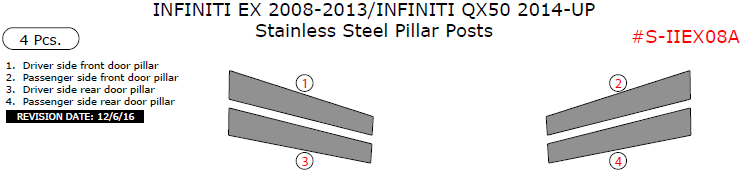 We offer a wide variety of colors and materials of Infinii EX 2008, 2009, 2010, 2011, 2012, 2013/Infiniti QX50 2014, 2015, 2016, Stainless Steel Pillar Posts, 4 Pcs. Choose your favourite option and place an order.