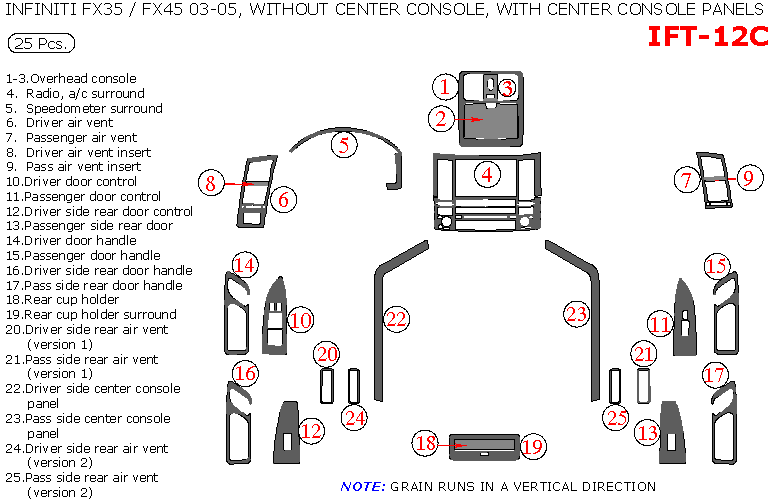 Infiniti FX 2003, 2004, 2005, Without Center Console Interior Kit, With Center Console Panels, 25 Pcs.