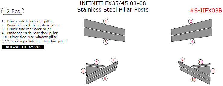 We offer a wide variety of colors and materials of Infiniti FX 2003, 2004, 2005, 2006, 2007, 2008, Stainless Steel Pillar Posts, 12 Pcs. Choose your favourite option and place an order.