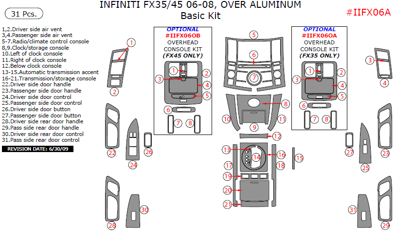 Infiniti FX 2006, 2007, 2008, Basic Interior Kit, Over Aluminum, 31 Pcs.