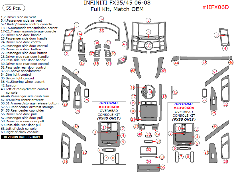 We offer a wide variety of colors and materials of Infiniti FX 2006, 2007, 2008, Full Interior Kit, 55 Pcs., Match OEM. Choose your favourite option and place an order.