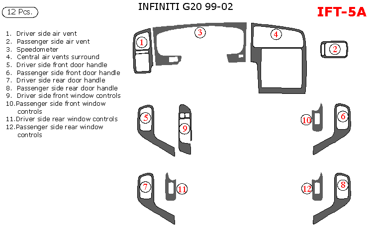 Infiniti G20 1999, 2000, 2001, 2002, Full Interior Dash Trim Kit, 12 Pcs.