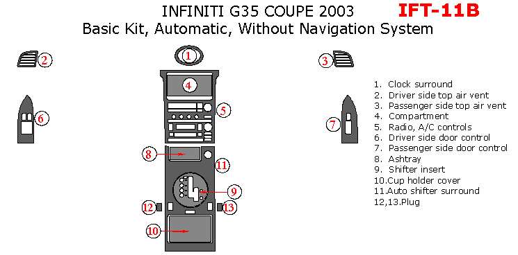 Infiniti G35 2003, Coupe, Basic Interior Kit, Automatic, Without Navigation System, 13 Pcs.