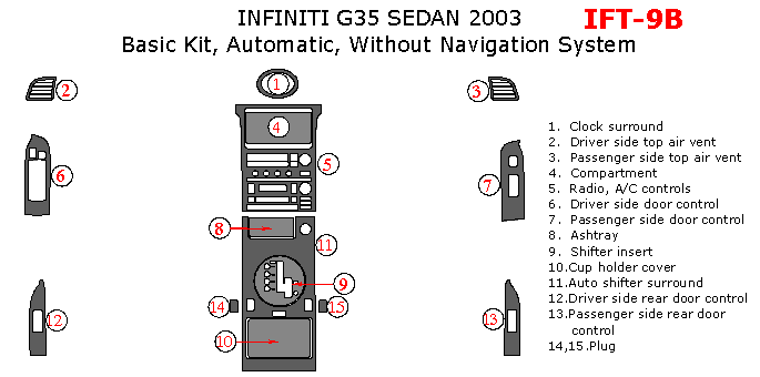 Infiniti G35 2003, Sedan, Basic Interior Kit, Automatic, Without Navigation System, 15 Pcs.