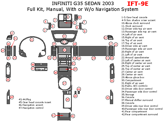 Infiniti G35 2003, Sedan, Full Interior Kit, Manual, With or W/o Navigation System, 47 Pcs.