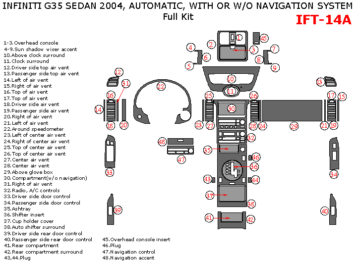 Infiniti G35 2004, Sedan, Full Interior Kit, Automatic, With or W/o Navigation System, 48 Pcs.