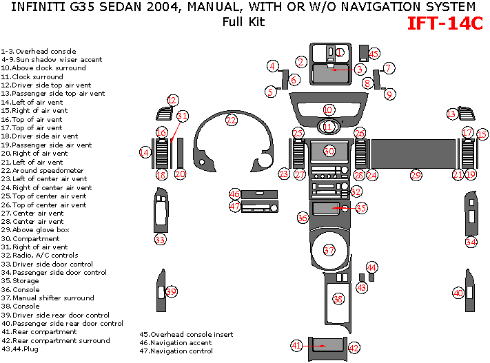 Infiniti G35 2004, Sedan, Full Interior Kit, Manual, With or W/o Navigation System, 47 Pcs.