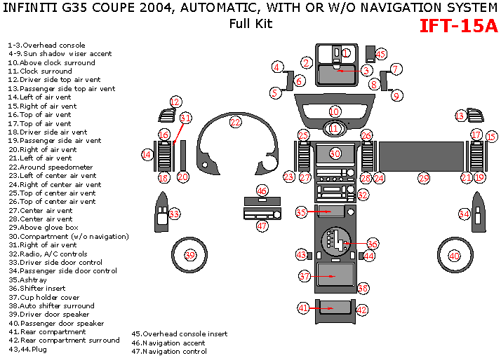 Infiniti G35 2004, Coupe, Full Interior Kit, Automatic, With or W/o Navigation System, 47 Pcs.
