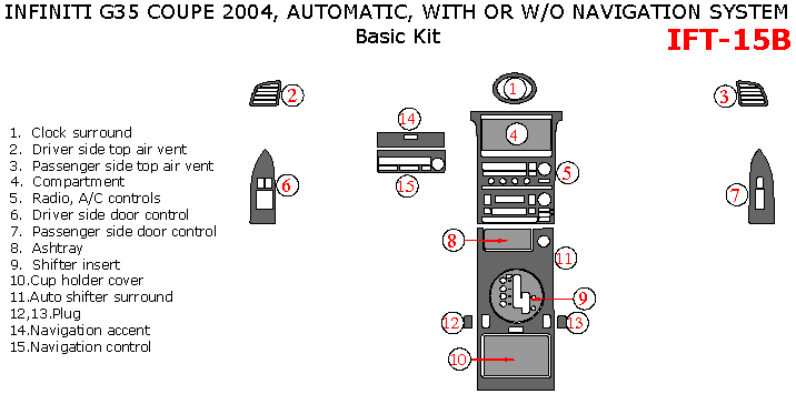 Infiniti G35 2004, Coupe, Basic Interior Kit, Automatic, With or W/o Navigation System, 15 Pcs.