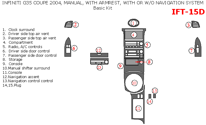 Infiniti G35 2004, Coupe, Basic Interior Kit, Manual, With Armrest, With or W/o Navigation System, 15 Pcs.