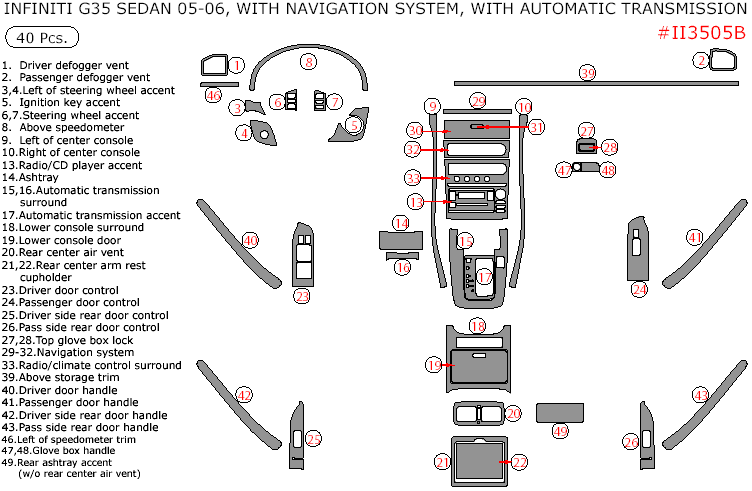 Infiniti G35 2005-2006, Interior Dash Kit, Sedan, With Navigation System, With Automatic Transmission, 40 Pcs.