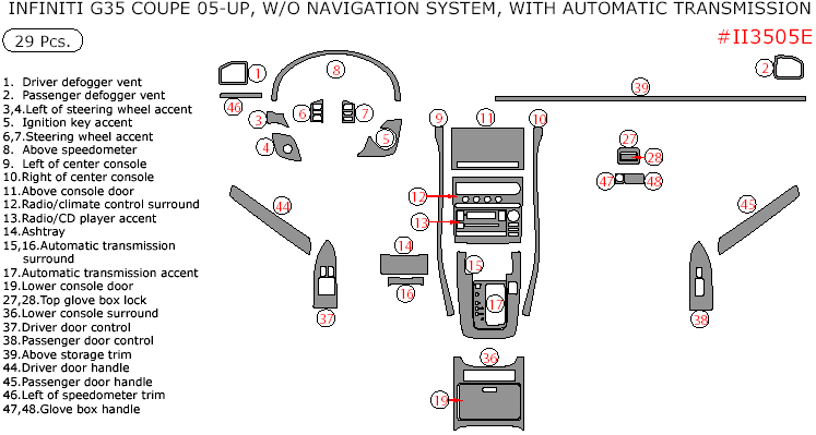 We offer Interior Dash Kit of 29 pieces in a wide variety of colors (black, blue, etc.) and materials (carbon fiber, wood, etc.) for Infiniti G35 2005, 2006, 2007, coupe, without navigation system, with automatic transmission. Choose your favourite option of this Infiniti G35 interior accessories and place an order to buy the high quality dash trim kit.