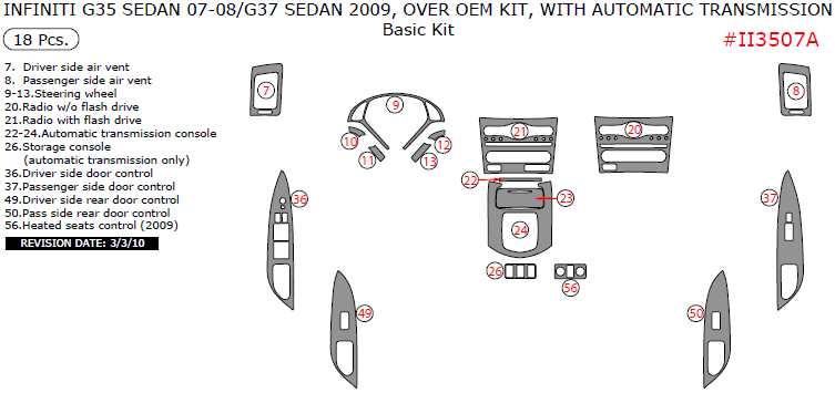 Infiniti G35 (2007-2008) / G37 (2009), Sedan, Over OEM Kit, With Automatic Transmission, Basic Interior Kit, 18 Pcs.