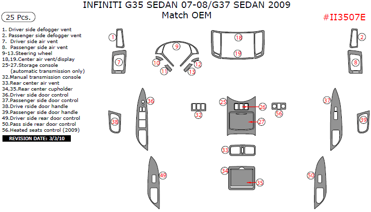 We offer a wide variety of colors and materials of Infiniti G35 (2007-2008) / G37 (2009), Interior Dash Kit, Sedan, Match OEM Kit, 25 Pcs. Choose your favourite option and place an order.