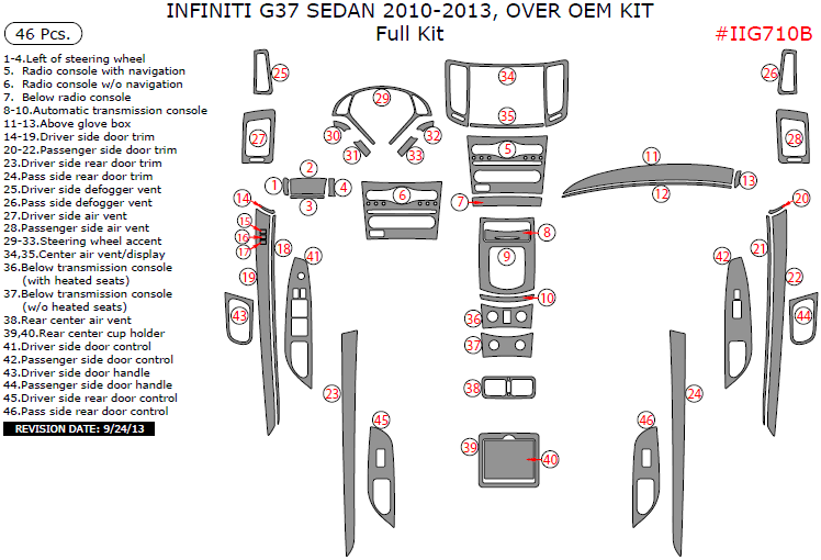 Infiniti G37 Sedan 2010, 2011, 2012, 2013, Over OEM Kit, Full Interior Kit, 46 Pcs.