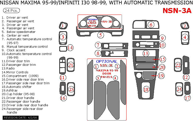 We offer a wide variety of colors and materials of Infiniti I 1998-1999, Nissan Maxima 1995, 1996, 1997, 1998, 1999, Interior Dash Kit, With Automatic Transmission, 24 Pcs. Choose your favourite option and place an order.