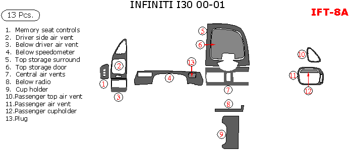 We offer a wide variety of colors and materials of Infiniti I 2000-2001, Interior Kit, 13 Pcs., Match OEM. Choose your favourite option and place an order.