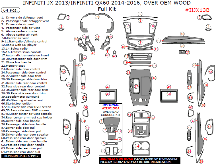 Infiniti JX 2013/Infiniti QX60 2014, 2015, 2016, Over OEM Wood, Full Interior Kit, 64 Pcs.
