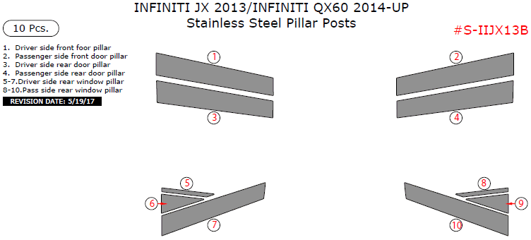 Infiniti JX 2013/Infiniti QX60 2014, 2015, 2016, Stainless Steel Pillar Posts, 10 Pcs.