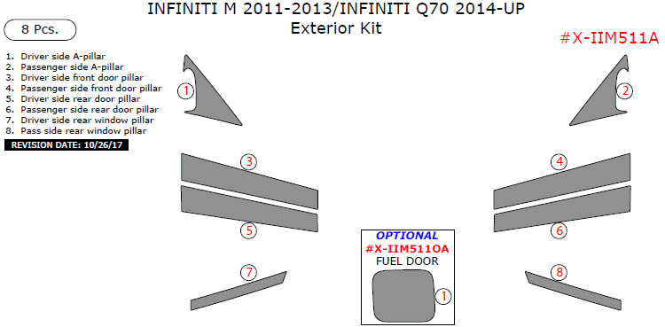 Infiniti M 2011, 2012, 2013/Infiniti Q70 2014, 2015, 2016, 2017, 2018, 2019 Exterior Kit, 8 Pcs.