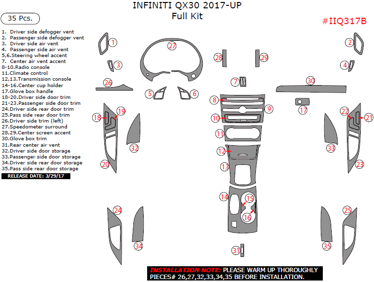 Infiniti QX30 2017-2019, Full Interior Kit, 35 Pcs.