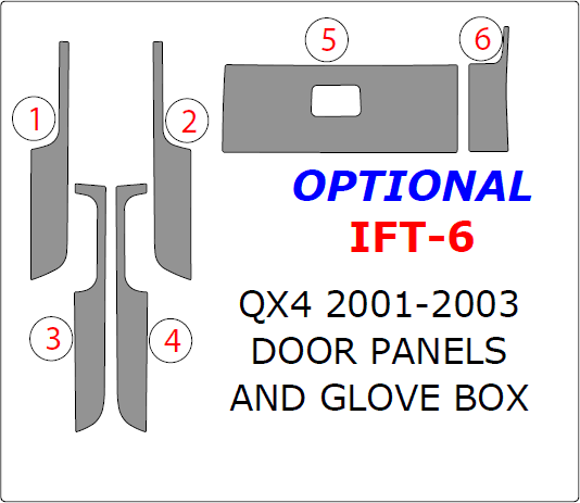 We offer a wide variety of colors and materials of Infiniti QX4 2001, 2002, 2003, Interior Dash Kit, Optional Door Panels and Glove Box, 6 Pcs., Match OEM. Choose your favourite option and place an order.