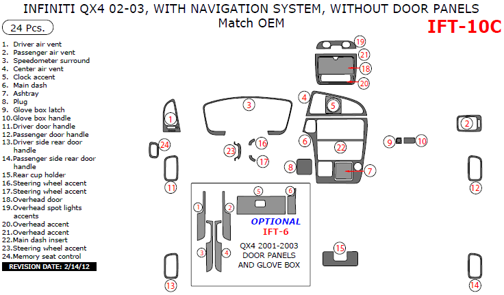We offer a wide variety of colors and materials of Infiniti QX4 2002-2003, Interior Dash Kit, With Navigation System, Without Door Panels, 24 Pcs., Match OEM. Choose your favourite option and place an order.
